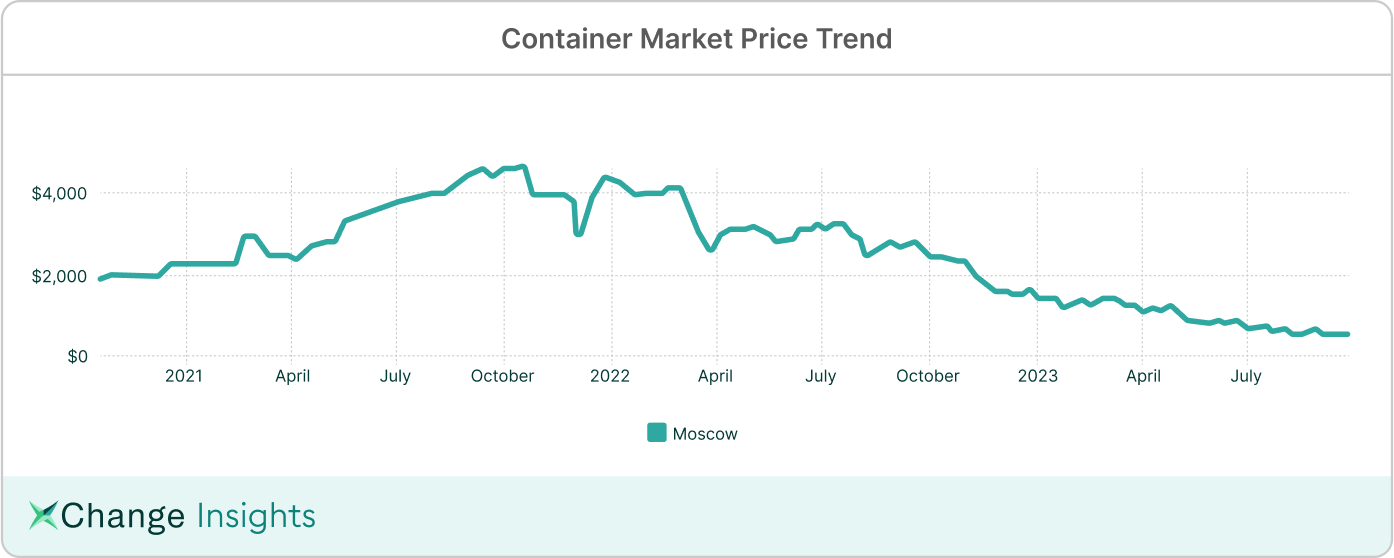 In February 2022, the average price of a 40ft high cube container in Moscow was $4,175, which is now $580 as of 25 September 2023. (See graph below)
