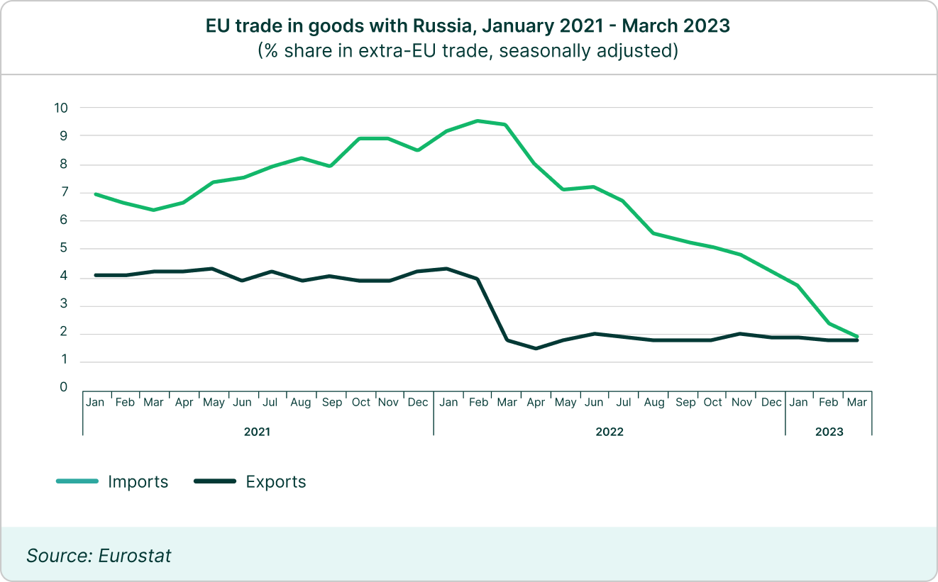 Both exports and imports have dropped considerably below the level prior to the invasion. Seasonally adjusted values show that Russia’s share in extra-EU imports fell from 9.6% in February 2022 to 1.7% in June 2023, while the share of extra-EU exports fell from 3.8 % to 1.4% in the same period.